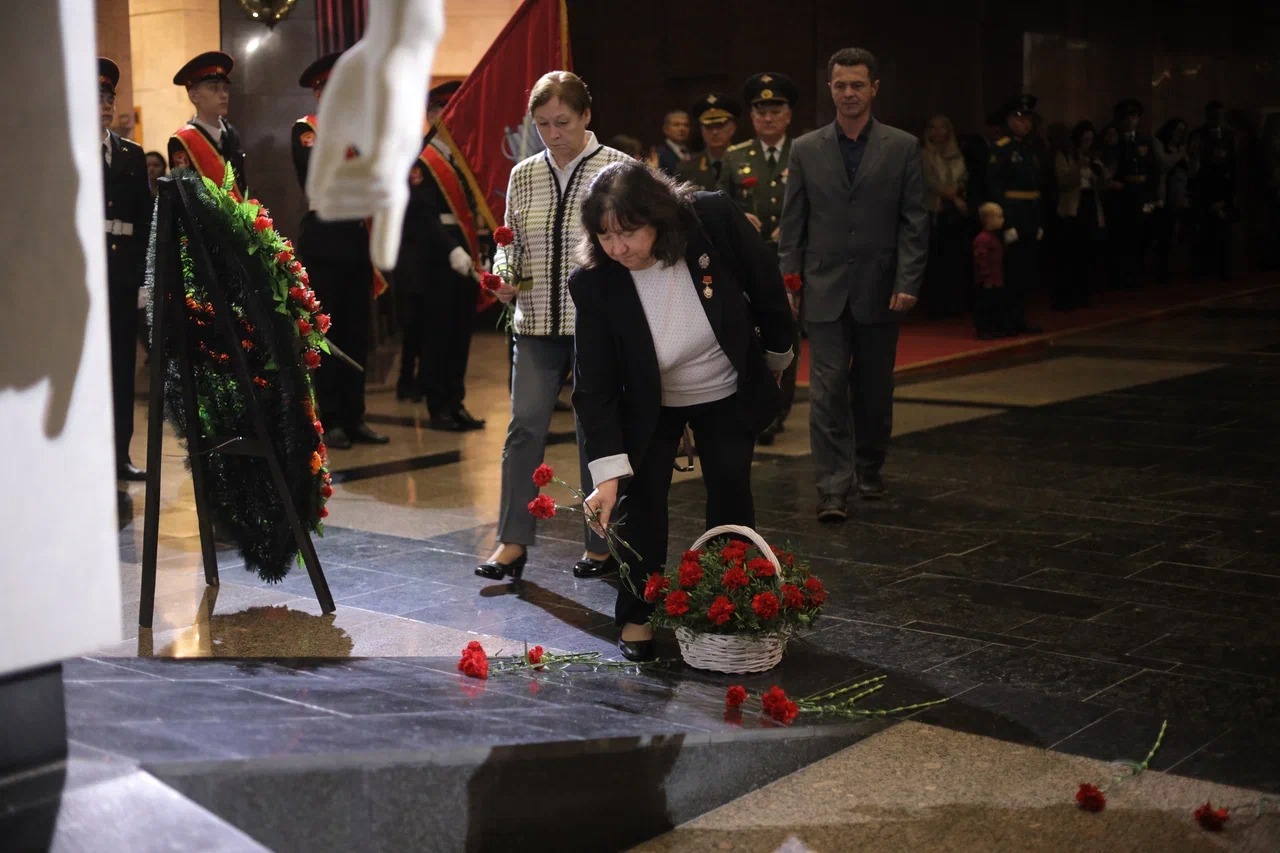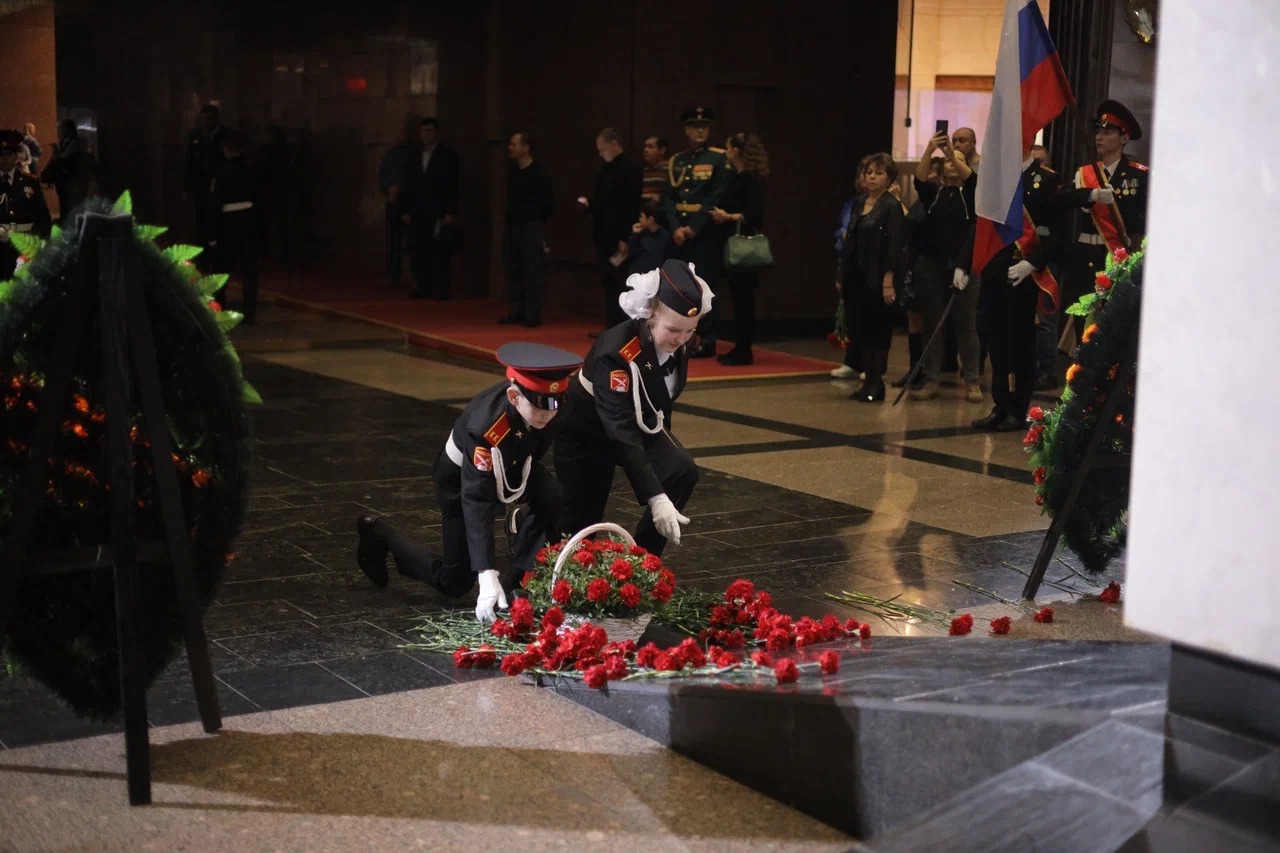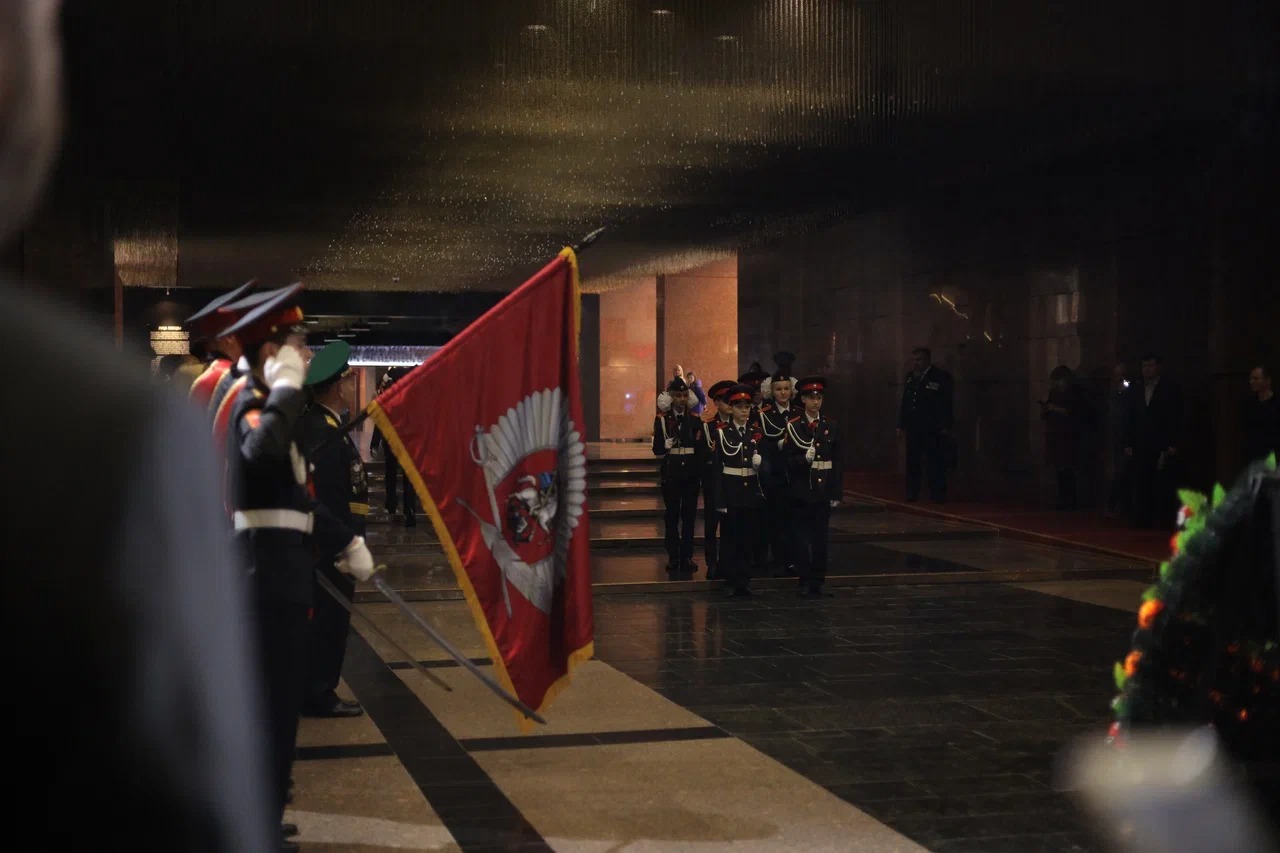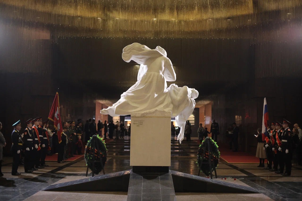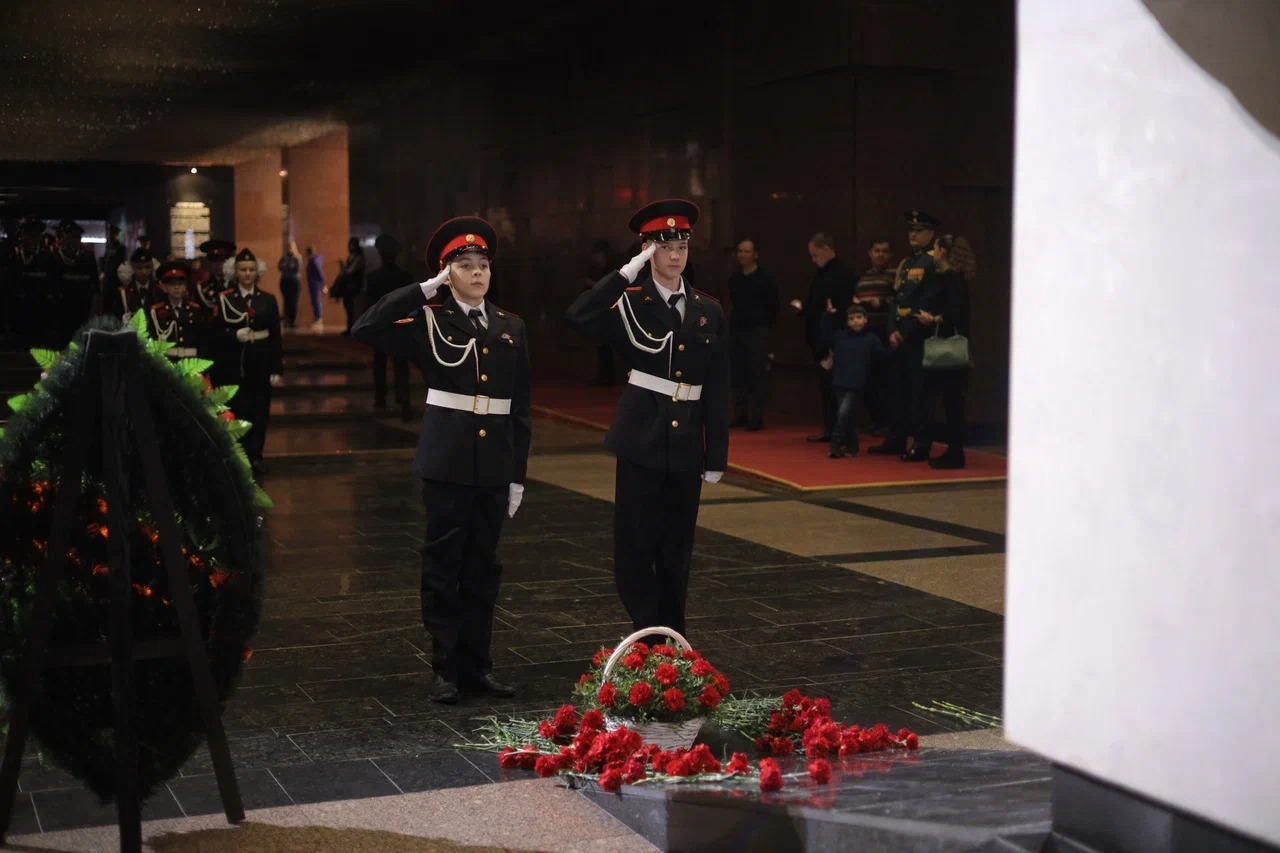 10 декабря в Музее Победы перед принятием присяги кадеты, их родители, гости церемонии минутой молчания почтили память погибших в Великой Отечественной войне и возложили красные гвоздики к подножию скульптуры "Скорбь" в Зале Памяти и Скорби.