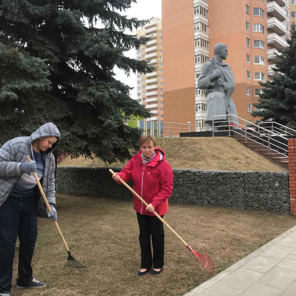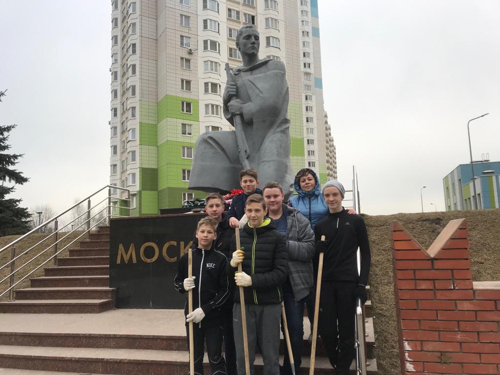 В преддверии 74-ой годовщины Победы в Великой Отечественной войне кадеты 7"К" класса вместе с воспитателем Чугуновой Г. М. привели в порядок территорию, прилегающую к памятнику Защитникам Москвы на Синявинской улице