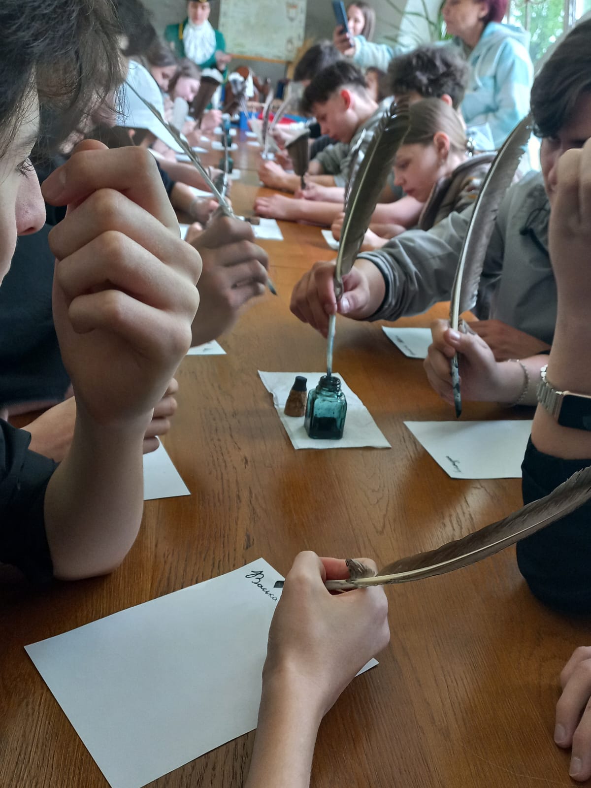 Во время интерактивной программы «Молодцу учение, державе просвещение» ребята попробовали писать настоящим гусиным пером, а на мастер-классе «Голос земли русской» изготовили колокольчики.